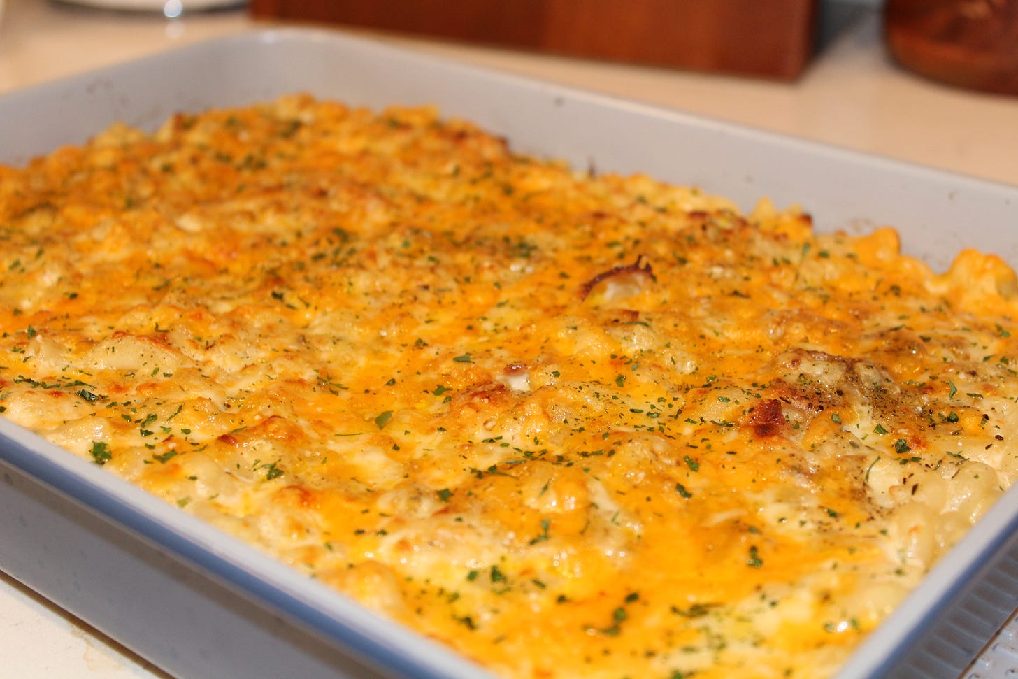 Transfer to a 13x9” (33x23cm) baking dish. Top with Death seasoning, remaining ¼ cup (28g) cheddar, and ¼ cup (28g) cheddar-gruyere. Cover with foil and bake for 15 minutes.