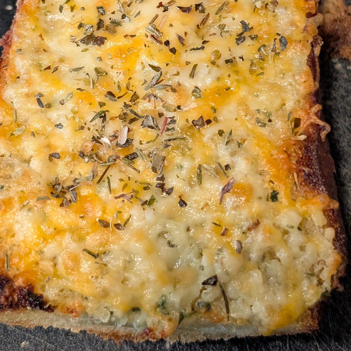 Bake the baguette on a sheet tray in the oven for 3-5 minutes or until the butter is melted and the baguette is starting to brown.